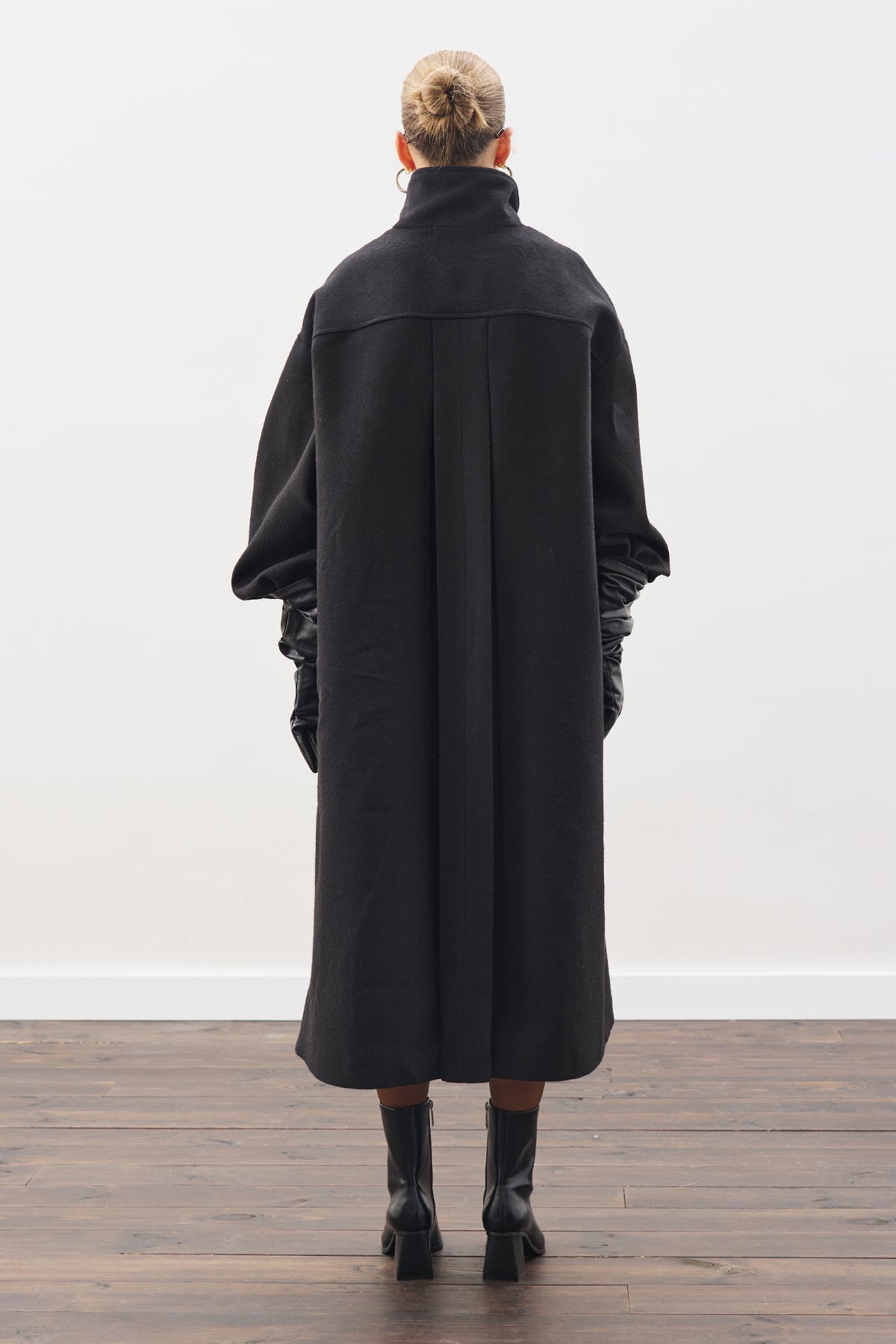 Dik yakalı, uzun kollu, tam boy, düğmeli, oversize kalıp, dokuma kumaş.