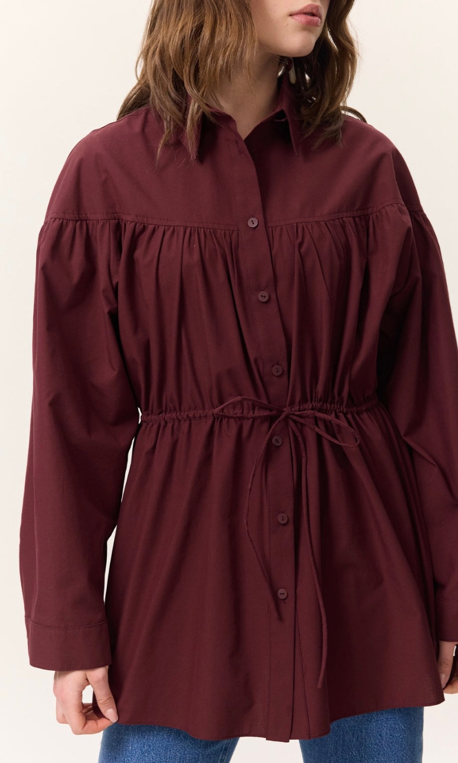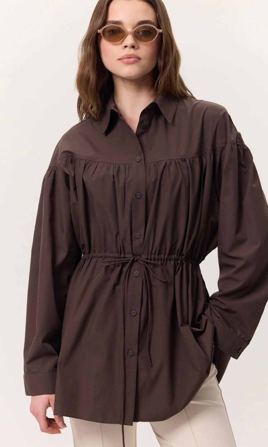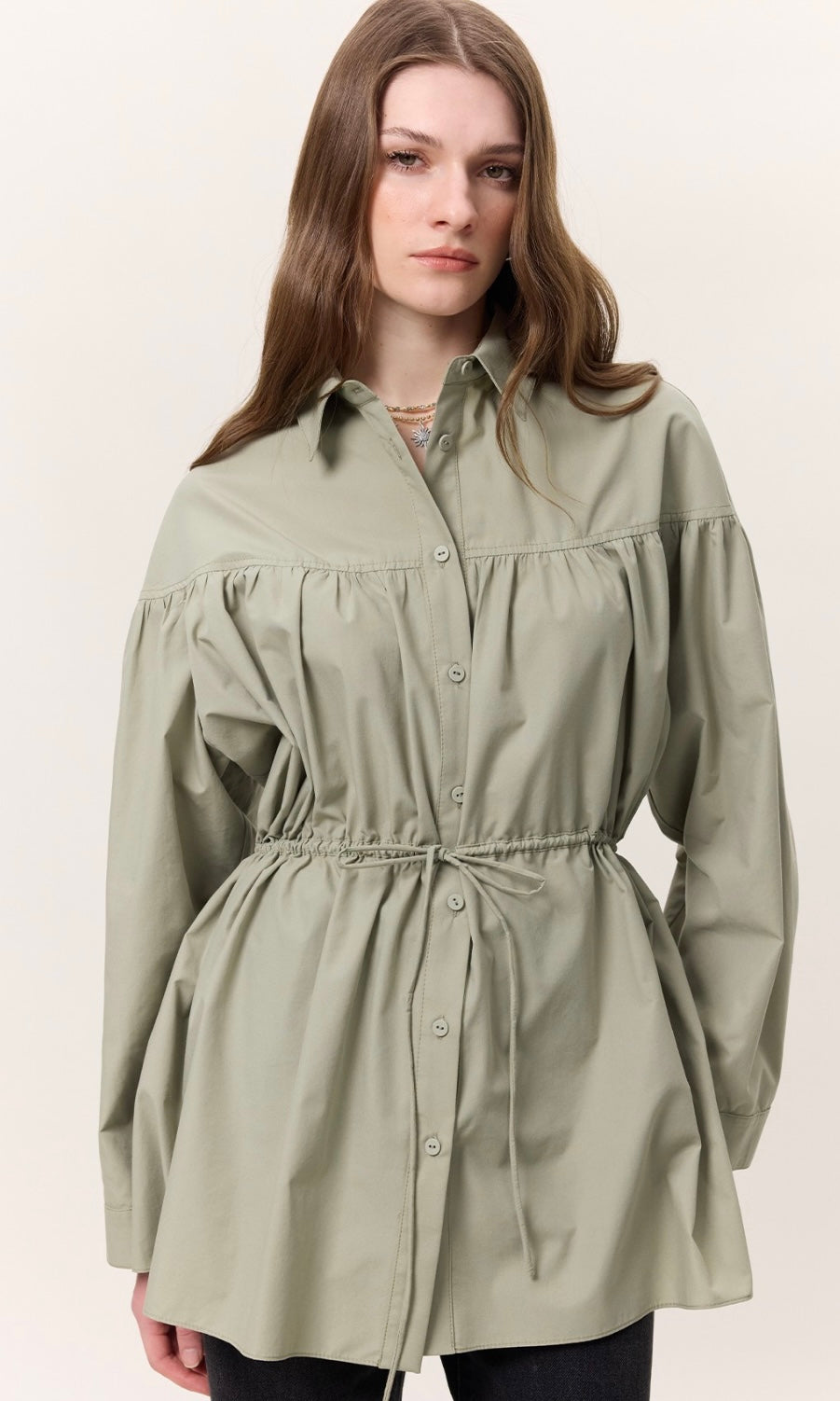 Gömlek yakalı, düğme kapamalı, büzgü detaylı, geniş formlu, uzun kol manşetli, kuşaklı, tunik boy.