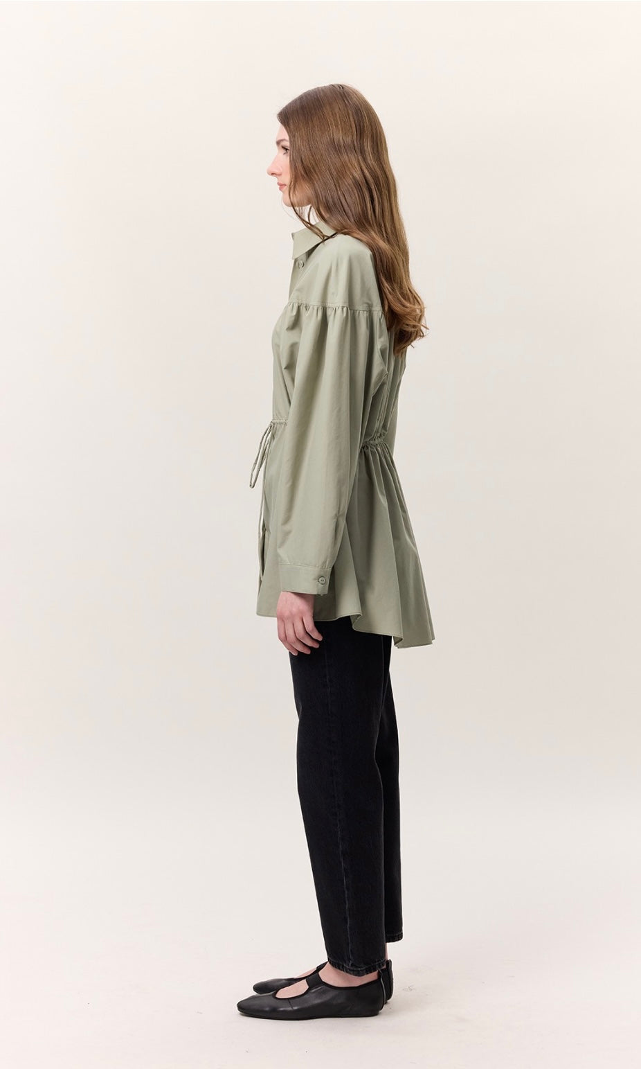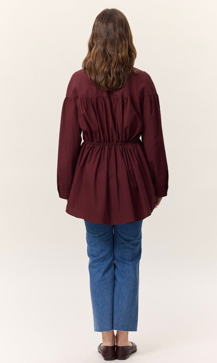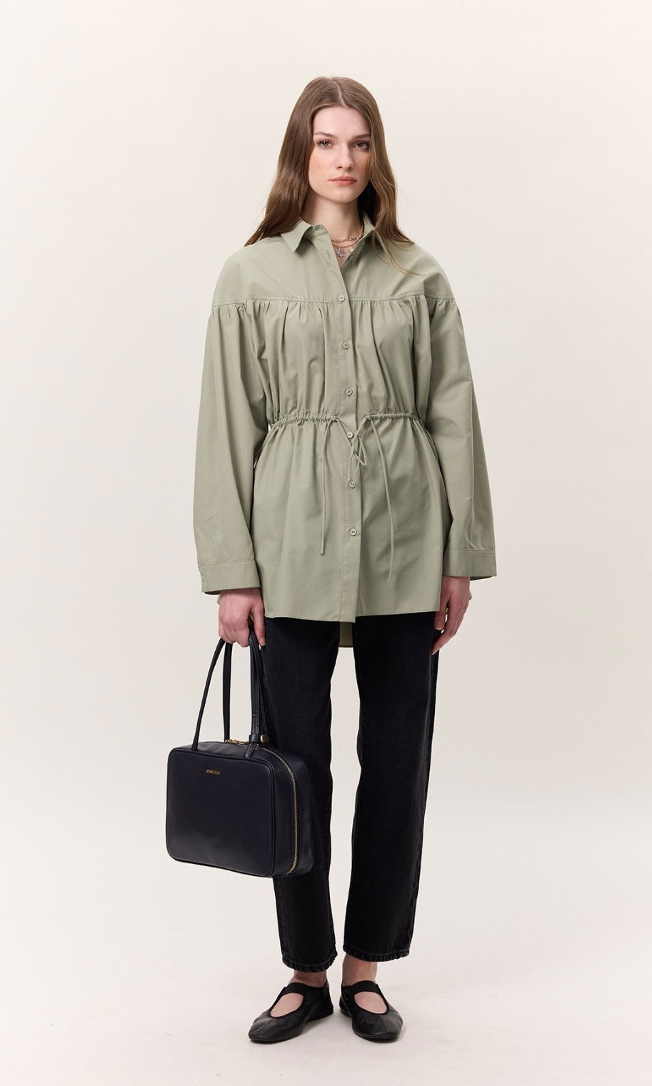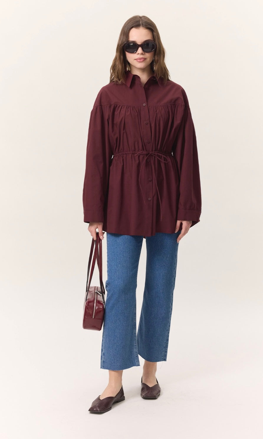 Gömlek yakalı, düğme kapamalı, büzgü detaylı, geniş formlu, uzun kol manşetli, kuşaklı, tunik boy.