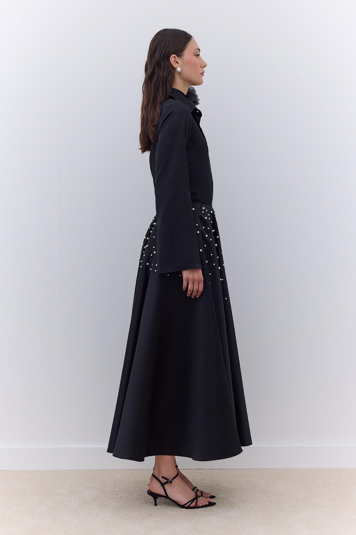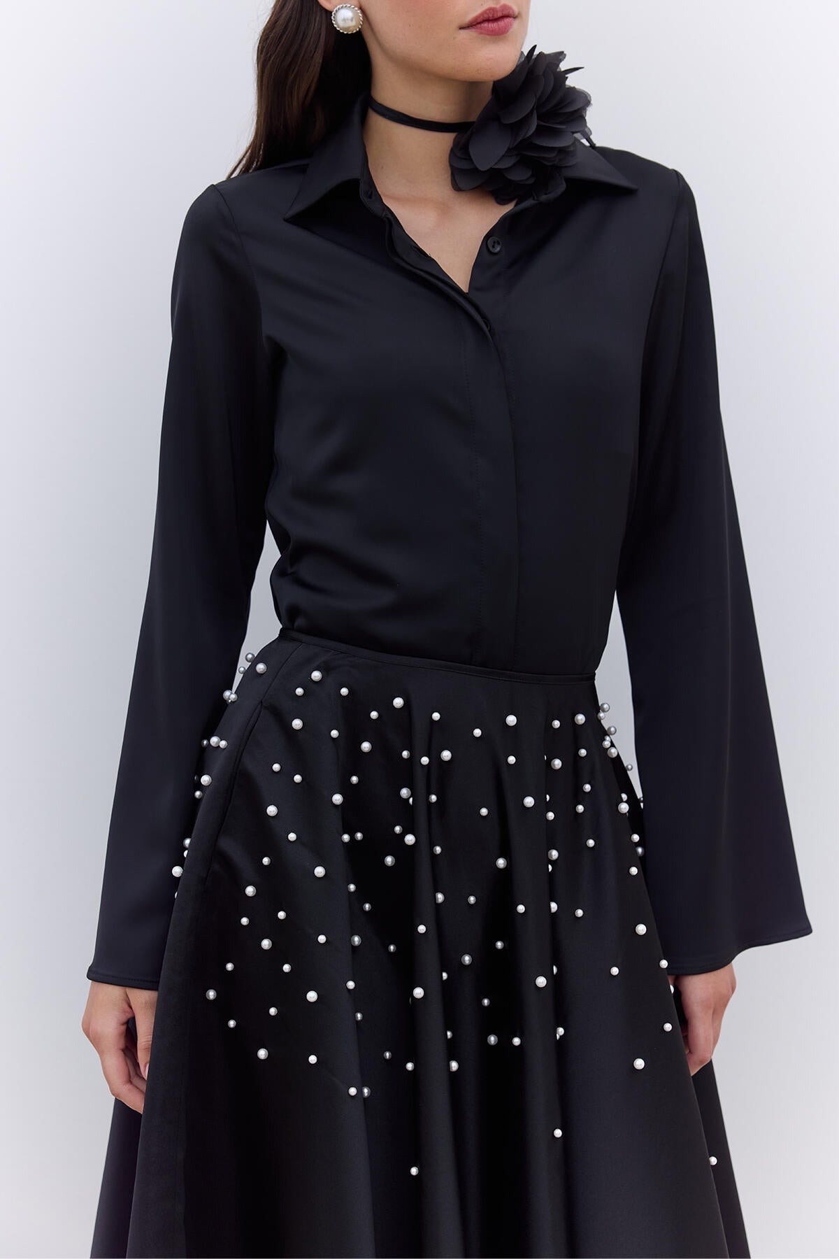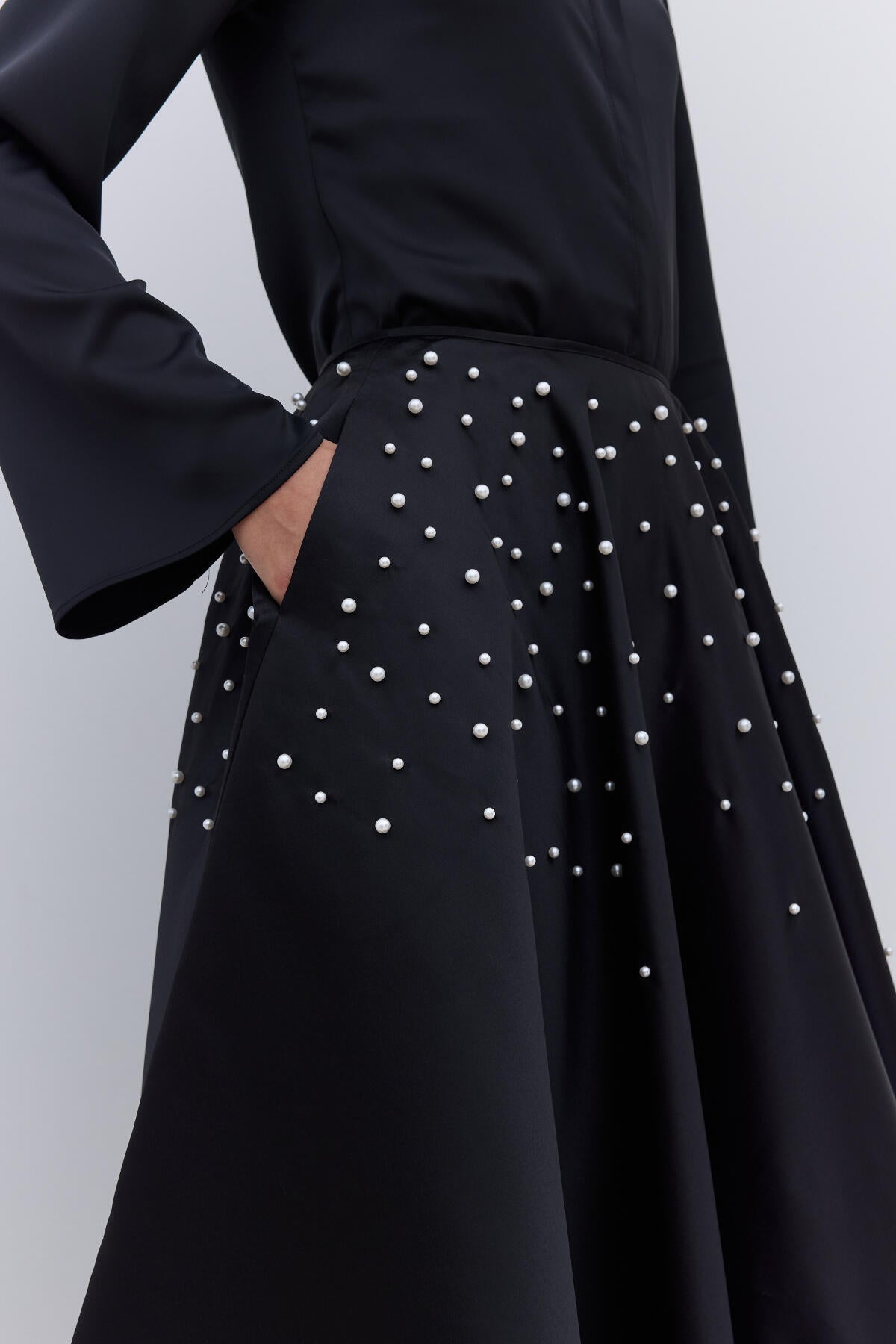 Elevate your style with this satin fabric skirt featuring a high waist and elegant pearl detailing. Designed with side pockets and a concealed zipper closure, this skirt offers a refined silhouette with its wide, flared hem.