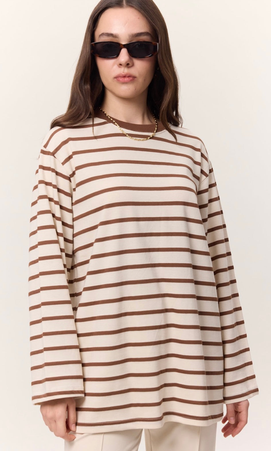 Yuvarlak yaka, renkli ribana detaylı, uzun kol, oversize kalıp, tunik boy, çizgili kumaştan üretilmiştir.