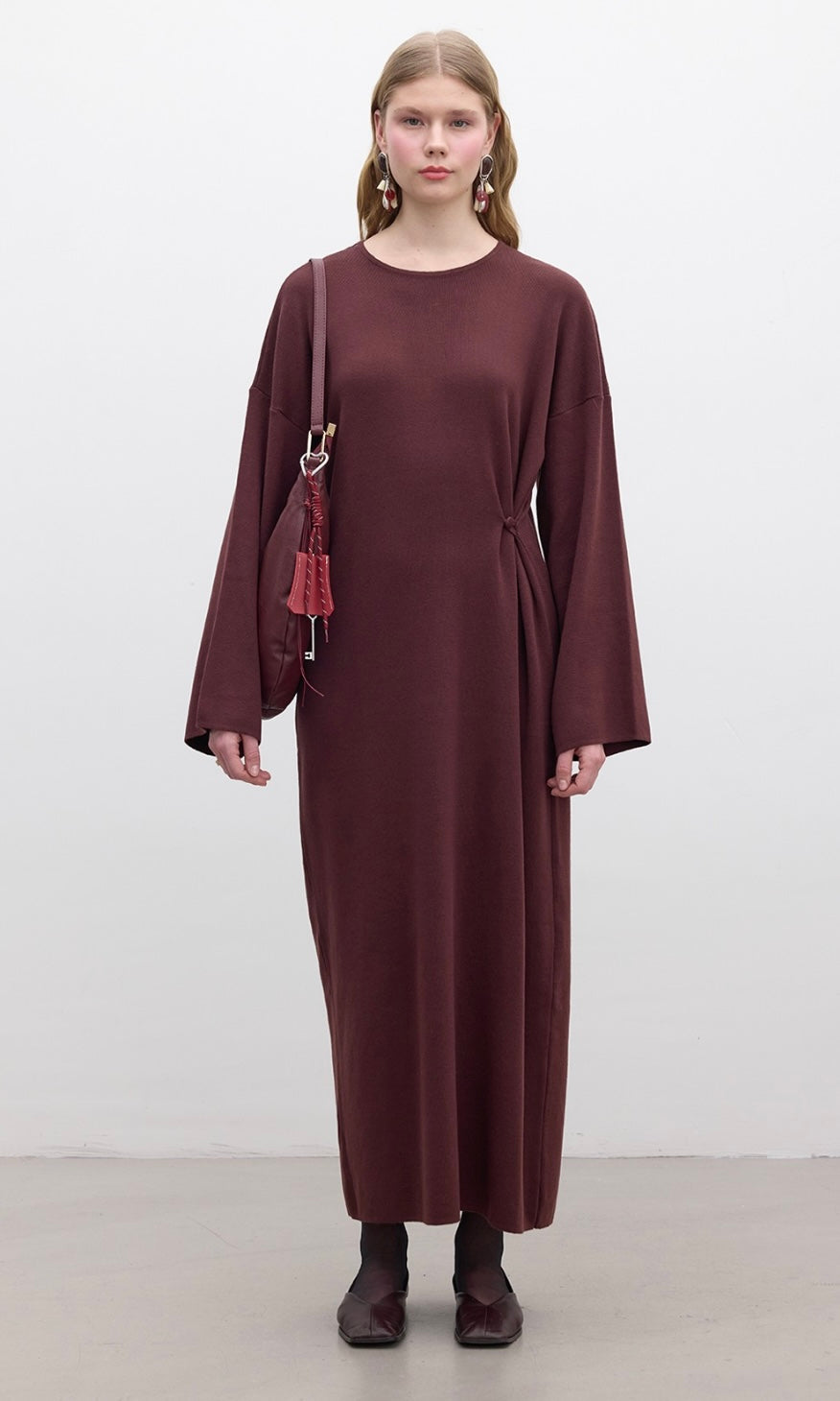 Düğme detaylı, uzun kollu, tam boy, bel ayarlamalı.